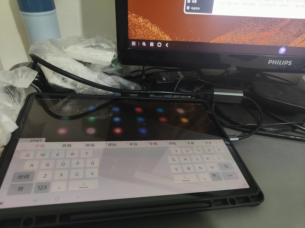 不好的地方,用键盘打字,使用中文输入法的时候,候选字是在平板上显示的,而不在显示器上显示。但是平板过一会会自动息屏,需要再点一下输入框,平板会自动亮屏,这个很影响体验。并且中文输入法一直在平板底部显示,如果能把这个输入法弄好,使用体验应该会好很多。