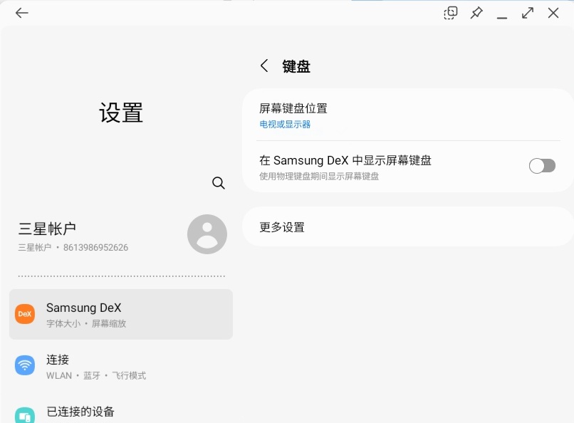 设置->Samsung DeX->键盘->屏幕键盘位置->选择 “电视或显示器”就可以了。