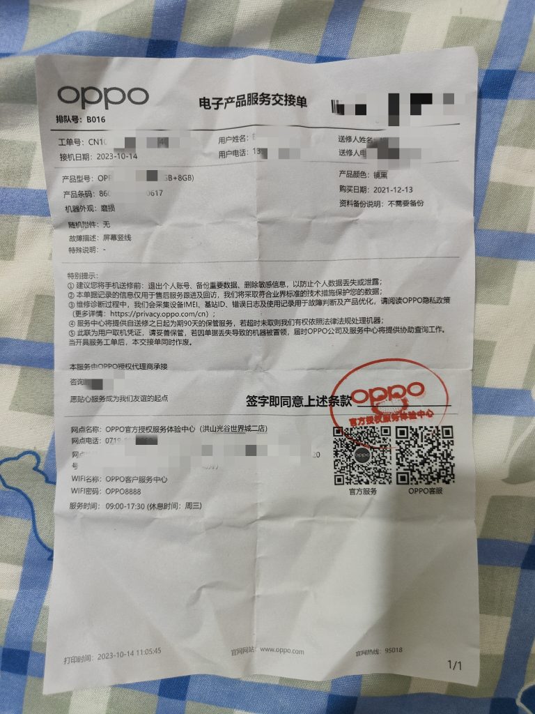 之前手机无缘无故出现亮线,今天去OPPO售后检测,到了之后先取号,等了差不多十分钟就轮到我了,签了检测同意书之后又是等待。差不多十多分钟出结果:屏幕坏了,确认没进水,没维修的话可以免费换一块屏幕,但是要调货,需要三天左右,可以换了的话会通知。也可以把手机放那边,提供备用机,修好了再通知。我反正也已经用了一个星期了,再用一个星期也没事,到时候换的话一个小时也够了。到正式去换的时候,还需要拆开屏幕,确认没进水,没拆开维修过,就可以免费换屏幕。手机快两年了,电池耗电比较快,本来如果要我自己花钱花屏幕的话,我就直接换手机了,反正自己换屏幕需要话费一千大几。
