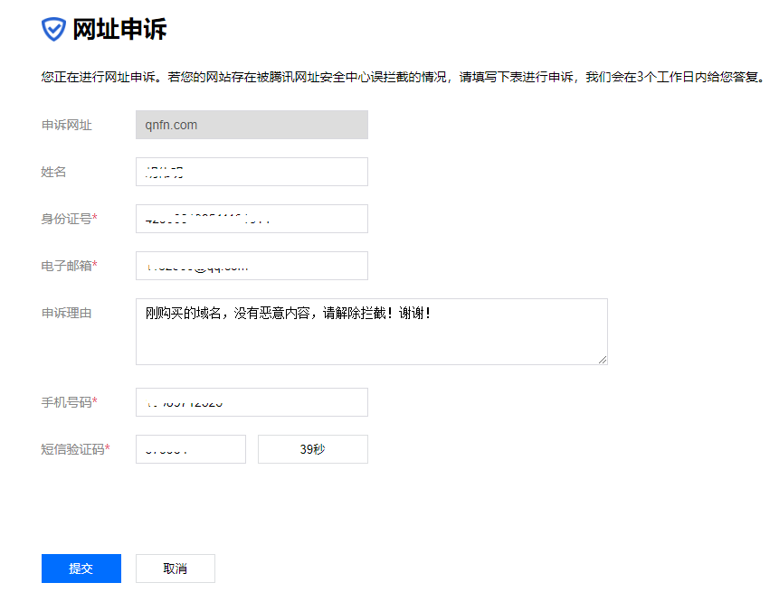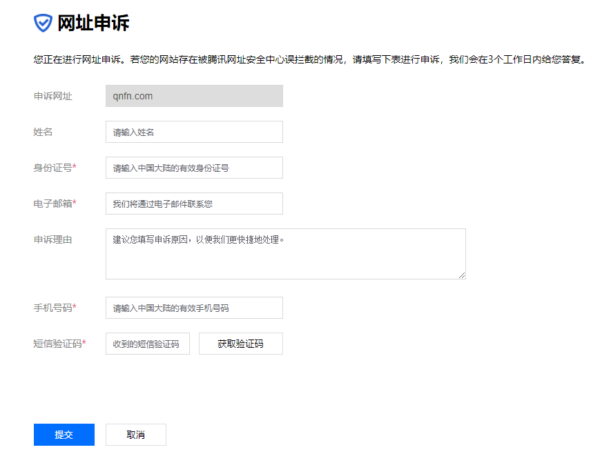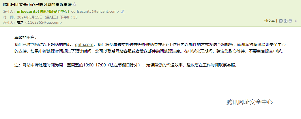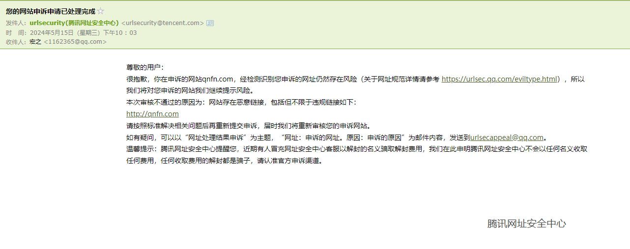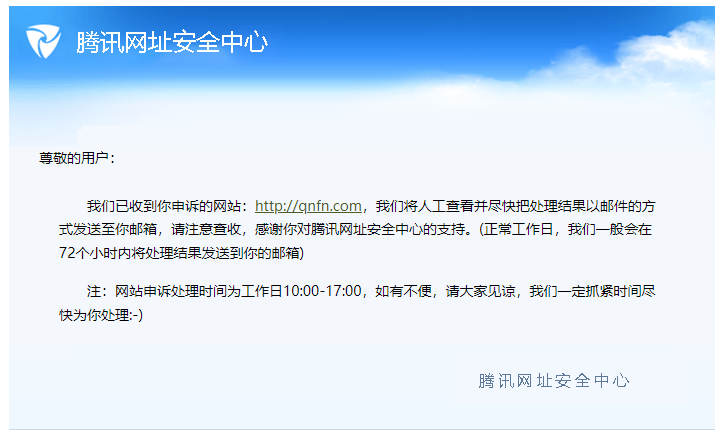 我们已收到您对以下网站的申诉:qnfn.com,我们将尽快核实处理并将处理结果在3个工作日内以邮件的方式发送至您邮箱,感谢您对腾讯网址安全中心的支持。如果申诉处理时间超过了预计时间,您可以联系网站客服或者发送邮件询问处理进度。在申诉处理期间,建议您耐心等待,不要重复提交申诉。