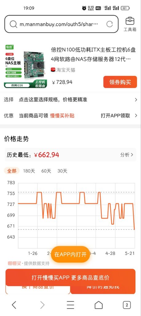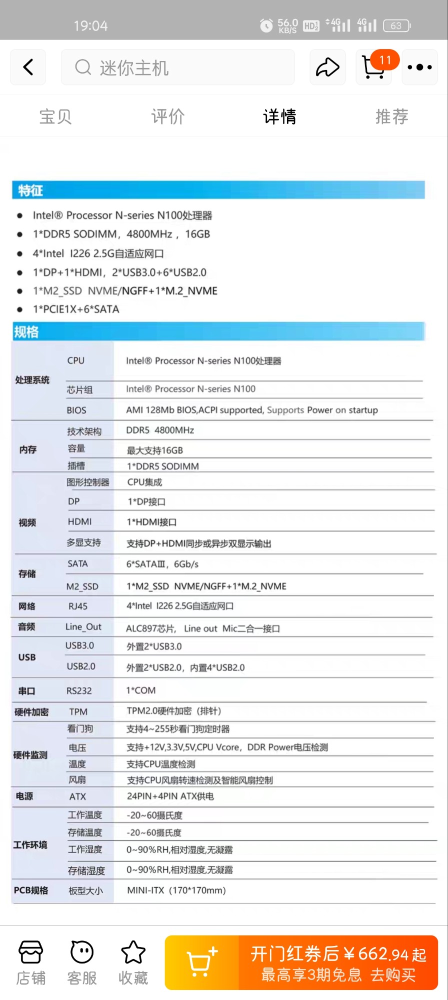 自己组NAS 2024-5-21 15:57 | BIEKUA | 300 | NAS,生活 | 2024-6-08 9:50 65 字 | 几秒读完 本文最后更新于 558 天前,其中的信息可能已经有所发展或是发生改变。 N100的CPU主板,目前淘宝上的价格是历史最低。 加一个机箱带300w电源,目前京东上是历史最低。 机箱可以放4块机械硬盘,电源有三根sata线。