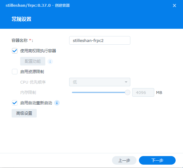 群晖docker安装frp 2024-5-26 21:13 | BIEKUA | 296 | 电脑 | 2024-5-27 12:39 38 字 | 几秒读完 本文最后更新于 570 天前,其中的信息可能已经有所发展或是发生改变。拉取镜像 docker pull stilleshan/frpc:0.37.0 与主机使用相同的网络 frpc.ini配置 文件装载路径:/frp/frpc.ini