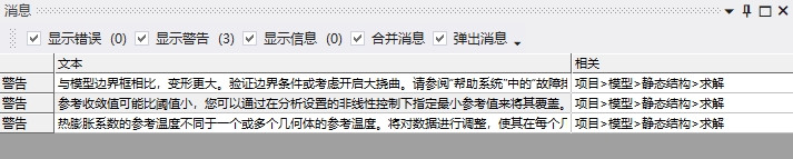 警告:与模型边界框相比,变形更大。验证边界条件或考虑开启大挠曲。请参阅“帮助系统”中的“故障排除”,以了解更多信息详情。