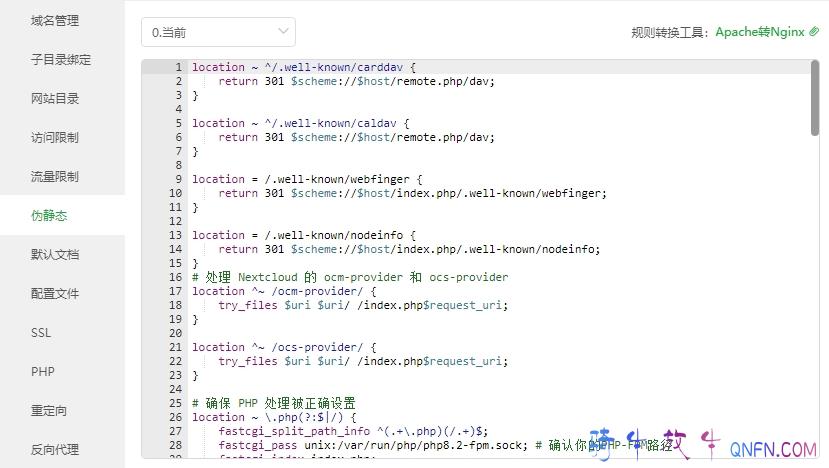 目录/www/server/nginx/conf下的enable-php-82.conf,比如82代表使用的是8.2版的PHP如果是其它版本的找到对于的配置文件。找到后添加如下代码: